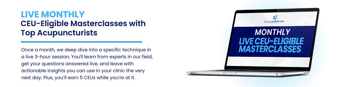Each live monthly masterclass provides 5 CEUs, approved through NCCAOM and/or California. Many of the archived trainings are also CEU-eligible. For most members, this covers the majority — if not all — of their yearly CEU requirements.