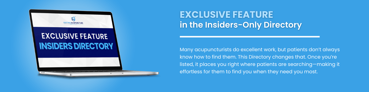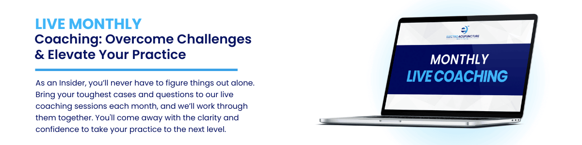 The Electro-Acupuncture Insider Membership is a private training and support community for licensed acupuncturists who want to sharpen their clinical skills and grow a thriving, referral-based practice. If your goal is to become a highly sought-after practitioner in your area (and beyond), this membership was built for you.